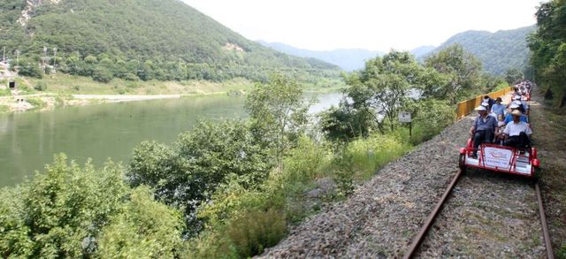 춘천시민이 김유정역~강촌역 8.2km 구간을 시승체험하는 모습. / 연합뉴스