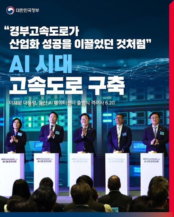 이 대통령은 "경부고속도로가 대한민국 산업화 성공을 이끌었던 것처럼 AI 데이터 센터 건설을 시작으로 과감한 세제 혜택, 규제혁신을 통해 민간의 투자를 촉진하고 대한민국 AI 대전환의 성공을 이끌 AI 시대의 고속도로를 구축하겠다"고 말했다.