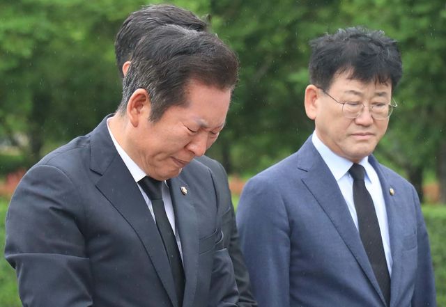더불어민주당 당 대표에 출사표를 던진 정청래 의원이 21일 오후 경남 김해시 진영읍 봉하마을을 찾아 노무현 전 대통령 묘역을 참배하고 있다. / 정청래의원실 제공