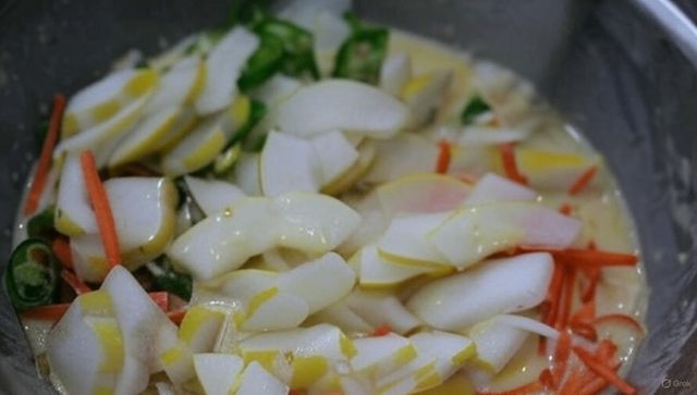 참외는 달콤한 맛과 아삭한 식감이 부침개에 독특한 풍미를 더한다. 재료는 간단하다. 멸치 육수 1컵 반(종이컵 기준), 부침가루 1컵, 빵가루 2큰술, 계란 1개, 작은 참외 1개, 당근 약간, 양파 1/4개, 청양고추 3~4개, 무 장아찌 약간, 포도씨유, 들기름을 준비한다.