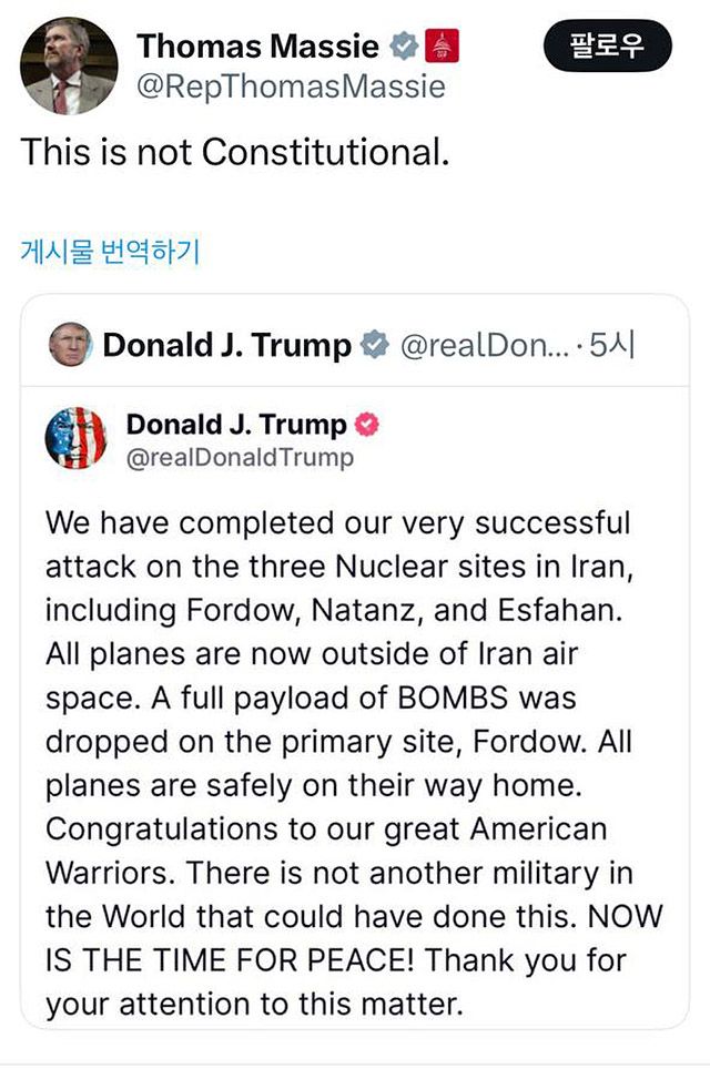 이러한 상황에서 공화당 내에서도 트럼프 대통령이 헌법을 위반했다는 지적이 나왔다. 마씨 의원은 이날 사회관계망서비스(SNS)인 'X'의 본인 계정에서 트럼프 대통령이 이란을 공격했다는 내용을 게재하며 "이것은 위헌적"이라고 규정했다.