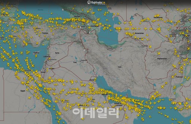 플라이트레이더24는 소셜 미디어 플랫폼 X에 “이란 핵 시설에 대한 미국의 공격에 앞서 지난주 새로운 영공 제한이 시행된 이후 이 지역을 다니던 민간 항공기들이 우회하고 있다”며 “항공기들이 이란, 이라크, 시리아, 이스라엘 상공을 비행하지 않고 있다”고 밝혔다.
