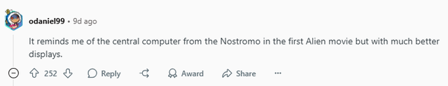 이거 보니까 《에이리언》 1편에 나오는 노스트로모 호의 중앙 컴퓨터가 떠오르네. 근데 훨씬 더 좋은 디스플레이를 갖춘 버전.