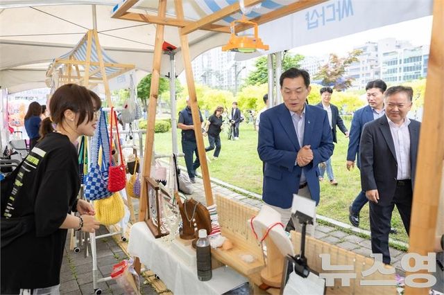 이재준 수원시장이 캠페인 장소에 마련된 부스를 둘러보고 있다./사진=수원시