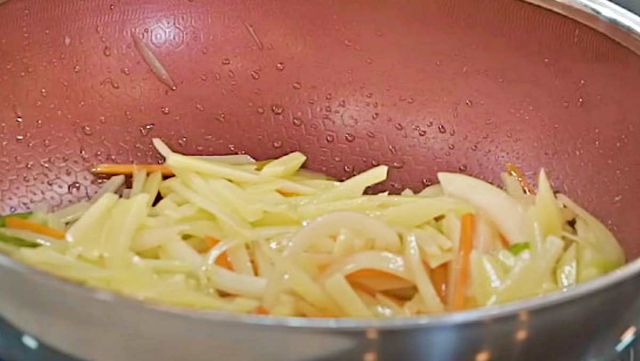 조리법은 복잡하지 않다. 감자는 껍질을 벗겨 가늘게 채썬 뒤 찬물에 담가 전분기를 뺀다. 전분을 제거해야 볶을 때 감자끼리 달라붙지 않고 고슬고슬한 식감이 살아난다. 그다음 끓는 물에 소금 한 꼬집을 넣고 감자채를 10~20초간 살짝 데친 뒤 찬물에 헹군다. 이 과정은 아삭한 식감을 유지하는 핵심 단계다.