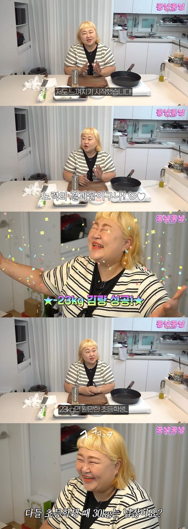 홍윤화는 "그래서 오늘 재봤더니 오늘 23kg이 빠졌다. 세상에 23kg이면 웬만한 초등학생이다"라고 언급하며 "나는 초등학생 때 30kg 넘었는데. 초등학교 지망생이다"라고 말해 웃음을 자아냈다.