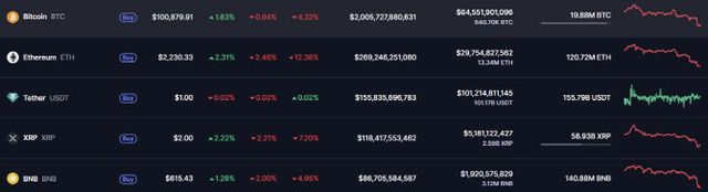 23일 글로벌 가상자산 시황중계 사이트 코인마켓캡에 따르면 이날 오전 7시 58분 기준 비트코인 가격은 24시간 전 대비 0.94% 내린 10만 879달러를 기록했다. 일주일 전과 비교하면 4.22% 하락했다. 알트코인(비트코인 외 가상자산)의 대표격인 이더리움은 전일 대비 2.46% 하락한 2230달러에 거래됐다.