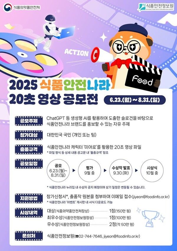 식품의약품안전처와 식품안전정보원은 오는 8월 31일까지 '2025 식품안전나라 20초 영상 공모전'을 개최한다고 23일 밝혔다.