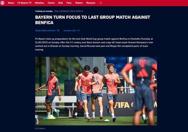 뮌헨은 23일 홈페이지를 통해 "보카전 이후 하루 휴식을 취한 선수단이 지난 일요일 아침 벤피카전 대비 훈련을 진행했다"며 "김민재가 팀 훈련 일부를 소화했다"고 알렸다.