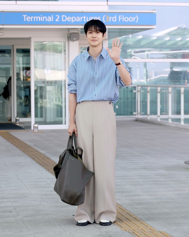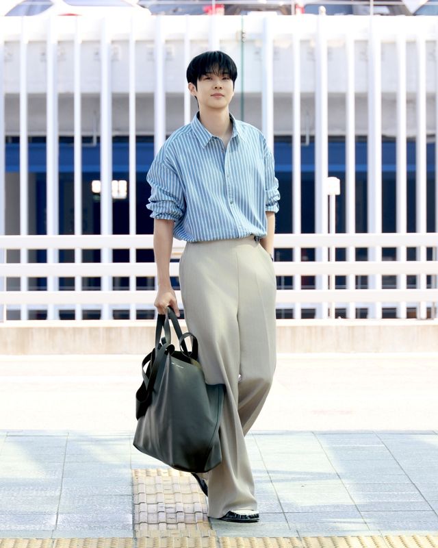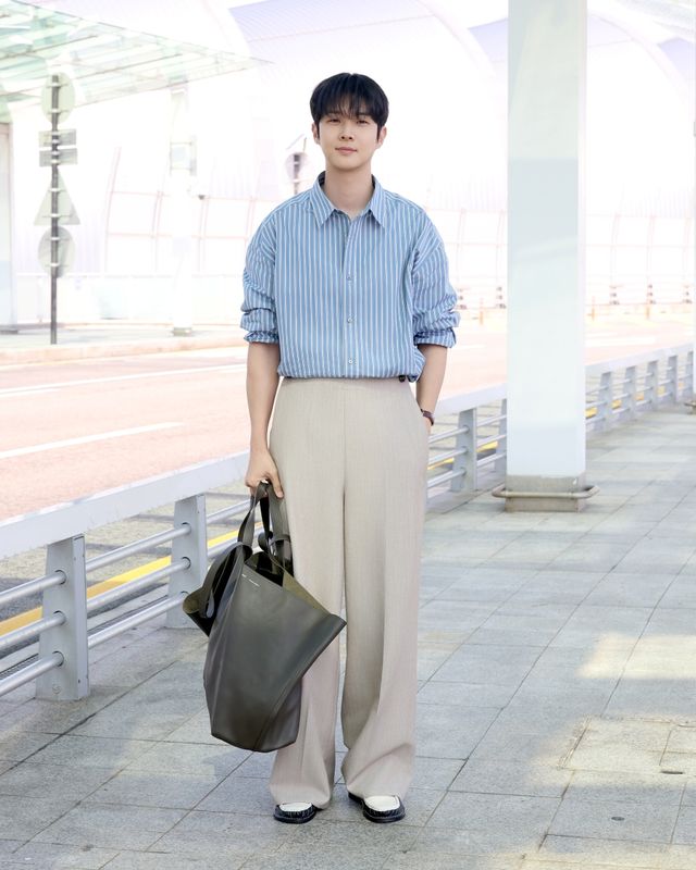 이날 최우식은 블루 스트라이프 셔츠와 루즈한 실루엣의 팬츠를 매치해 무심하면서도 세련된 여름 스타일링을 연출했다. 여기에 블랙 토트백과 컬러 블록 디테일이 돋보이는 로퍼를 더해 실용적이면서도 감성적인 무드를 완성했다.