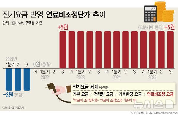 정부는 한전에 "2025년 3분기 연료비 조정단가는 한전의 재무 상황과 연료비 조정요금 미조정액이 상당한 점 등을 고려해 지난 2분기와 동일하게 ㎾h당 +5원을 계속 적용할 것을 통보한다"고 전했다.