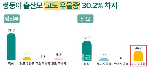 23일 인구보건복지협회의 ‘쌍둥이 임신·출산·육아 부모 대상 우울 자가검진’ 설문 결과 459명 중 30.2%가 출산 12주 이내 고도 우울증을 경험했다고 답했다. 경도 우울증도 9.3%나 된다. ‘정상’ 응답자도 60.5%나 되지만, 그렇지 않은 경우도 39.5%나 되는 것이다. 양육 초기 양육 부담으로 인한 스트레스가 주요 원인으로 보인다.
