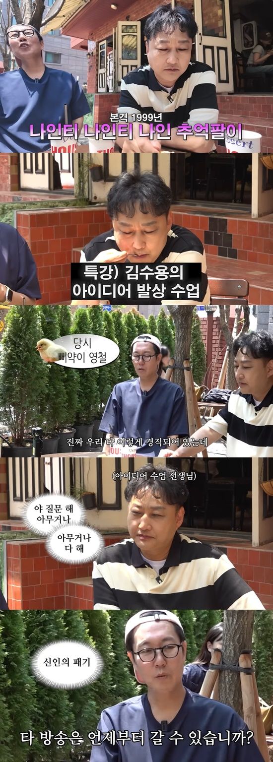 한 카페에서 김수용과 만남을 가진 김영철은 "어제 누워있는데 기억이 나더라. 전유성 선배님 한 번, 김수용 선배님 한 번 해서 아이디어 발상법에 대해서 수업을 했다"고 운을 뗐다.