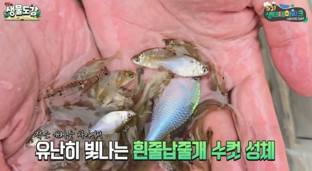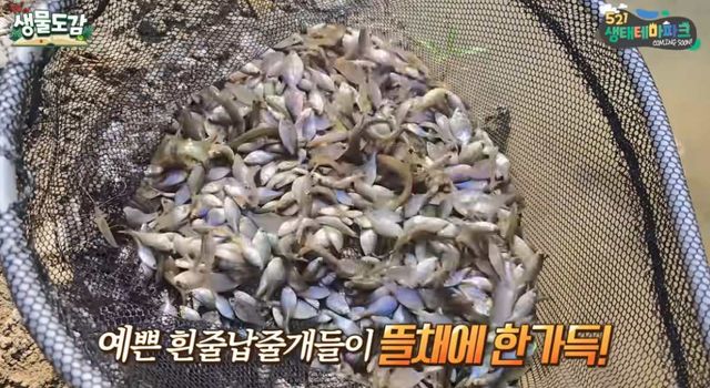 이에 TV생물도감 측은 다시 통발이 설치된 포인트로 돌아갔고, 그곳에서 다소 충격적인 장면이 펼쳐졌다. 통발 안에는 수십 마리의 흰줄납줄개가 빼곡히 들어 있었다. 양식장도 아닌 자연 상태에서 이 정도 수량이 잡히는 건 처음 보는 일이라며 TV생물도감 측은 경이로움을 표했다.