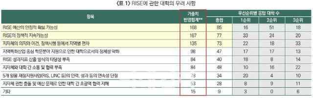 총장들은 이런 라이즈 사업 예산의 안정적 확보 가능성을 가장 크게 우려했다. 라이즈 사업에 대한 우려 사항을 1~3순위로 응답받은 뒤 1순위에 3점, 2순위 2점, 3순위 1점을 부여한 결과 예산의 ‘안정적 확보 가능성’이 85점으로 가장 높았다.