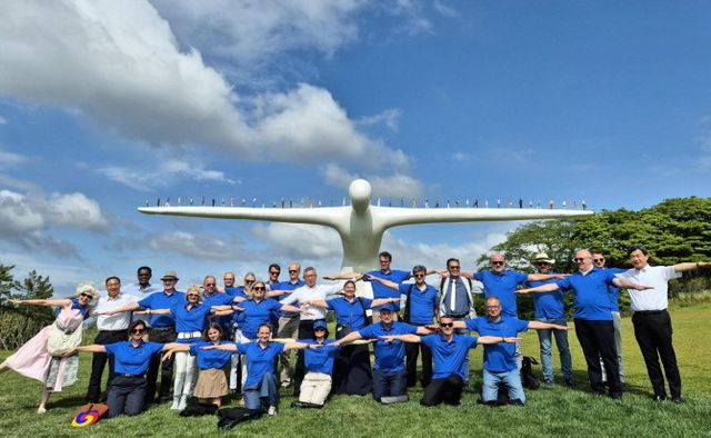 솔라시도 산이정원에 설치된 조형물 '브릿지맨' 앞에서 주한 EU 대사단이 단체 기념촬영을 하고 있다. © BS한양