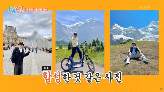 지난 22일 방송된 KBS2 '1박 2일'에서는 신혼여행 간 김종민이 빠진 채 문세윤, 조세호, 이준, 딘딘, 유선호가 활약하는 모습이 담겼다. 특히 눈길을 끈 것은 멤버들의 김종민 신혼여행 사진 언급.