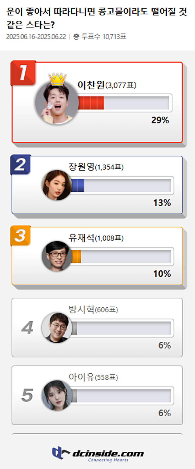 최근 커뮤니티 포털사이트 디시인사이드가 `운이 좋아서 따라다니면 콩고물이라도 떨어질 것 같은 스타는?`으로 투표를 한 결과 이찬원이 1위에 올랐다. 이 투표는 지난 16일부터 22일까지 총 7일간 진행했다.