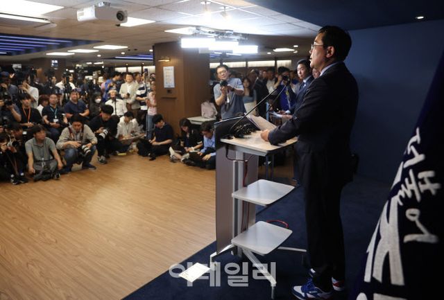 | [이데일리 노진환 기자] 박찬대 더불어민주당 의원이 23일 오전 서울 영등포구 여의도 중앙당사에서 당대표 출마선언 기자회견을 하며 취재진의 질문에 답하고 있다. |