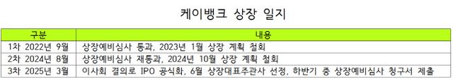 케이뱅크의 IPO 도전은 이번에 세 번째다. 첫 시도는 2022년으로 그해 9월 예비심사를 통과했지만, 국내 증시 부진과 투자 심리 위축 등의 이유로 2023년 1월 계획을 철회했다. 당시 국내 증시는 코로나19 팬데믹 이후 2021년에 코스피지수가 3300포인트를 넘기며 사상 최고치를 기록했지만, 2022년엔 2100선까지 급락하는 등 시장 상황이 최악으로 치달았다. 또 인터넷전문은행 중 처음으로 2021년 상장한 카카오뱅크가 공모가(3만 9000원) 이하로 주가가 떨어지며 2022년 10월 역대 최저가인 1만 5800원까지 주저앉는 등 케이뱅크가 높은 가치를 평가받기 어려웠다는 분석이다.