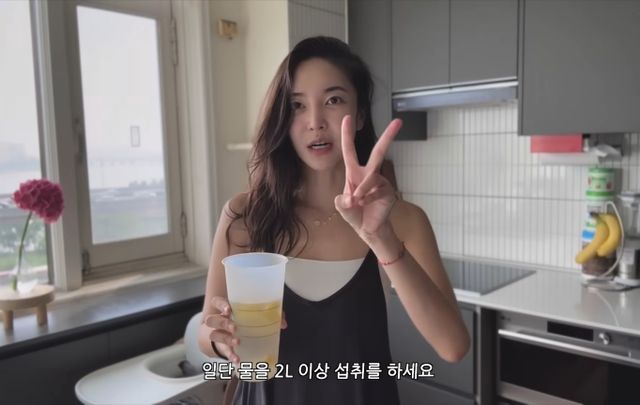 자신만의 다이어트 루틴을 공개하기 시작한 김윤지는 "폭식 다음날 일단 물을 2L 이상 섭취한다. 몸의 염분을 빼준다는 생각으로 물을 무조건 많이 드셔야 한다"면서 두 번째로 공복을 최대한 오래 유지해야 한다고 강조했다.