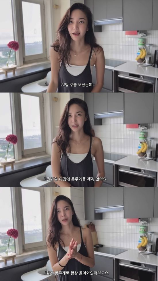 김윤지는 "저는 '치팅 데이'가 아니라 '치팅 주'를 보낸다. 항상 월요일을 기준점으로 삼아서 리셋하는 생활을 하고 있다"면서 "저처럼 치팅 데이로 인한 폭식과 음주가 있었다면 월요일 아침에 몸무게를 재지 않는다. 숫자를 보는 순간 멘탈이 흔들리고 운동이랑 식단을 할 사기가 떨어진다"고 솔직하게 털어놨다.