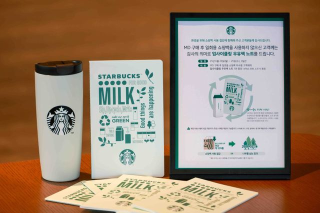 스타벅스는 이벤트 기간 동안 전국 매장에서 MD 상품 구매 후 일회용 쇼핑백을 구매하지 않는 고객을 대상으로 ‘우유팩 업사이클링 노트’를 매장별 선착순 20명에게 증정한다.