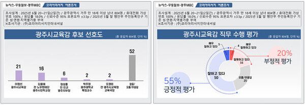 이번 여론조사는 국내 통신 3사가 제공한 휴대전화 가상번호(100%)를 활용, 전화면접 조사 방식으로 진행했다. 광주시민 만18세 이상 남녀 4474명과 통화, 이 중 804명이 응답을 완료했다. 응답률은 18.0%이다. 표본오차는 95% 신뢰수준에 ±3.5%포인트다.