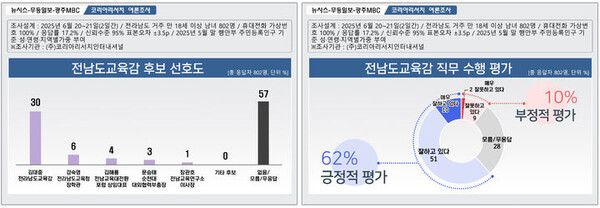김 교육감은 50대 연령 층(38%)과 전남 서남권(38%)·진보 성향층(35%)·더불어민주당 지지층(32%)에서 강세를 보였다.