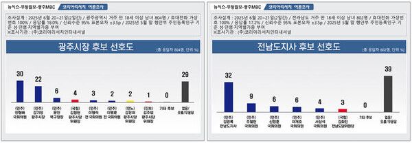 이번 여론조사는 국내 통신 3사가 제공한 무선전화 안심번호(100%)를 활용해 만18세 이상 남녀 광주시민과 전남도민 대상 전화면접으로 진행했다.