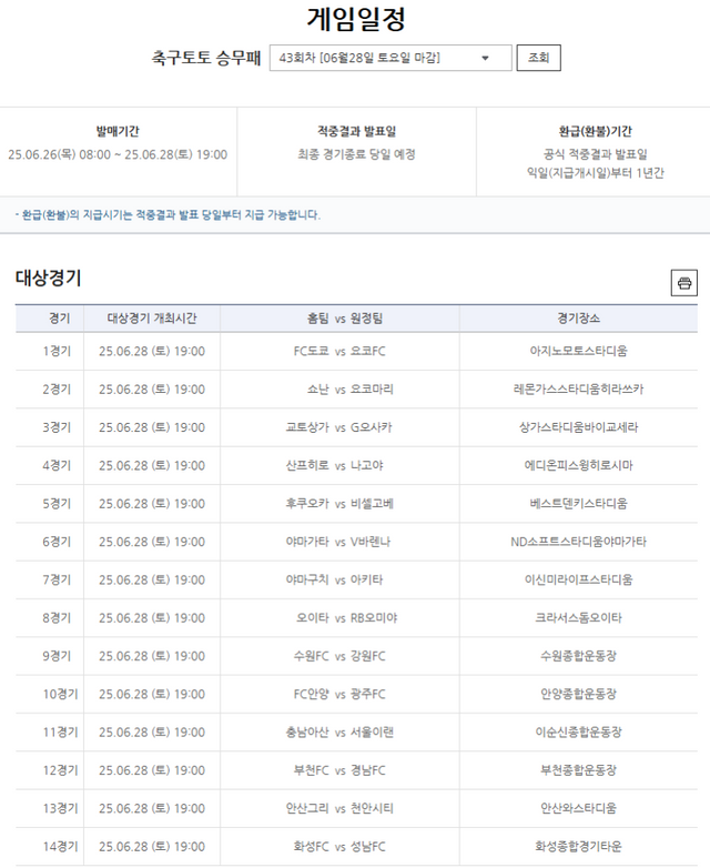 K리그 및 J리그 14경기 대상, 결과는 다수 무승부 발생…43회차 오는 26일 오전 8시 발매 개시