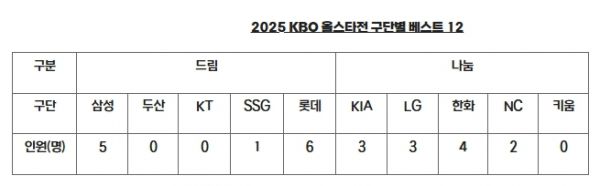 한편, 2025 신한 SOL뱅크 KBO 올스타전에 출전할 양 팀 감독(드림 올스타 박진만 감독, 나눔 올스타 이범호 감독)은 각 팀 13명씩, 총 26명의 추천선수를 선정해 추후 발표할 예정이다.