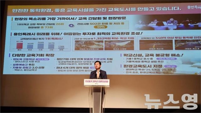 이 시장은 25년 난제였던 경안천 수변구역 해제(2024년 11월), 삼가2지구 힐스테이트 아파트 진입로 문제 해결, 동백IC 개설 확정, 옛 경찰대 터 개발 정상화, 지방도 315호선 공사 재개, 플랫폼시티 개발이익 용인에 재투자 명문화 등을 주요 난제 해결 성과로 제시했다.