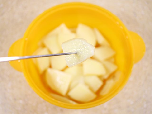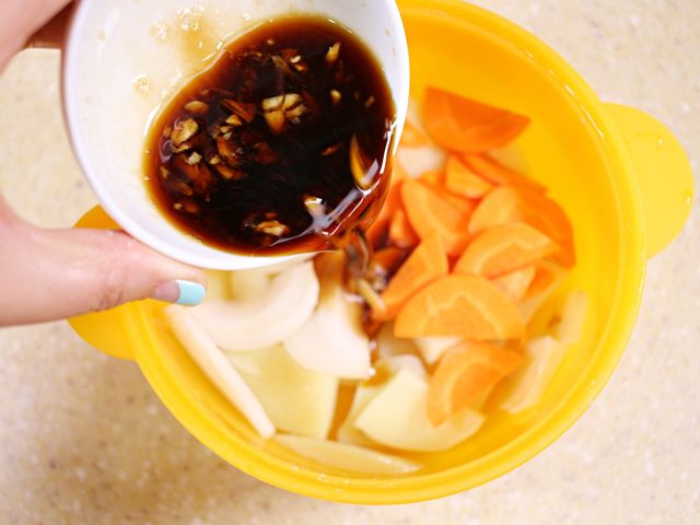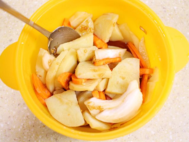 전자레인지에서 데운 감자에 양파, 당근