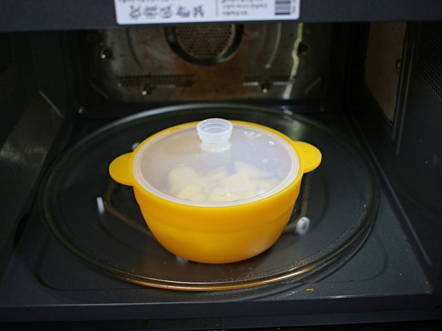 썰어둔 감자를 전자레인지 용기에 담고