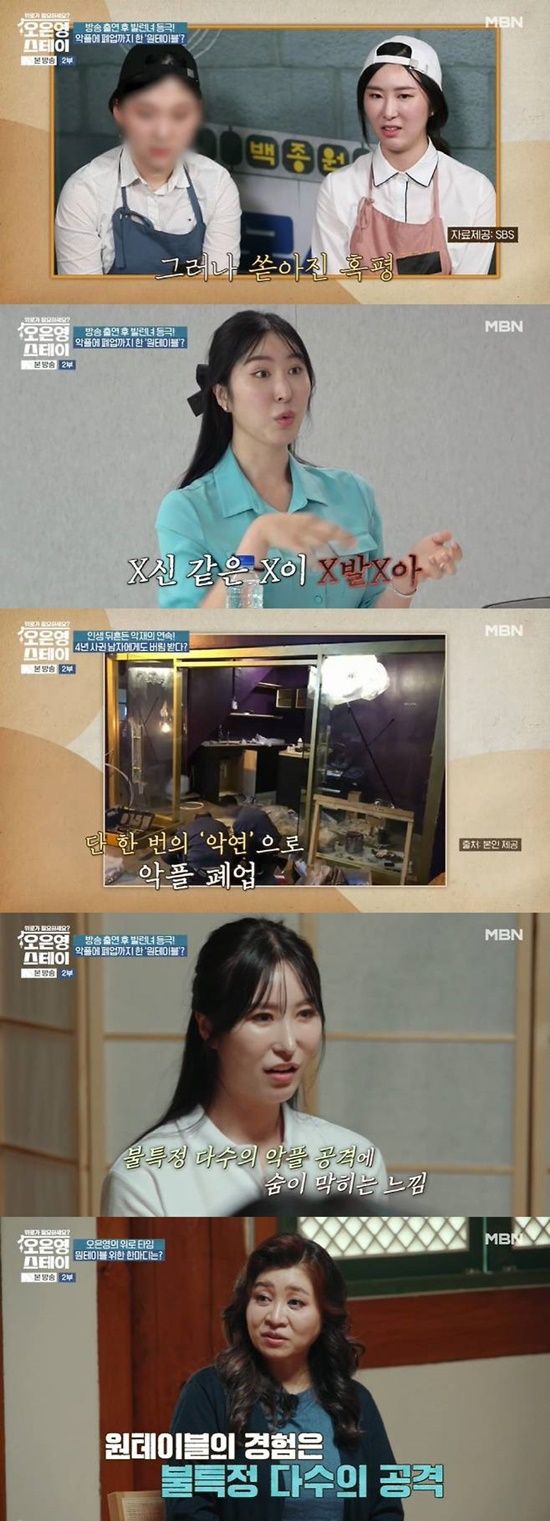 이어 원테이블은 "엄청난 악플을 받았다. '말 X 들어라. 개념 없는 X아'같은 진짜 심한 말이었다. 저를 개념과 생각이 없고 레시피만 바라는 사람으로 보더라. 'X신 같은 X이' 이런 악플이 매일 왔다. '나 같으면 살기 싫을 것 같아' 이런 이야기를 하는데 '내가 진짜 죽었으면 좋겠나'하는 생각까지 들었다"고 털어놓았다.