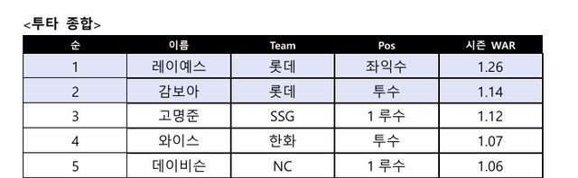 한편 타자 부문 WAR 2위는 1.12를 기록한 SSG 랜더스 내야수 고명준이다. 이숭용 감독이 "30홈런·100타점 이상 기록할 수 있는 자질을 갖췄다"라며 극찬한 선수다. 그는 6월 출전한 17경기에서 타율 0.379를 기록했다.