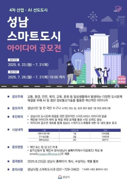이번 공모전은 교통, 환경, 안전, 복지, 교육, 문화 등 일상생활에서 발생하는 다양한 도시문제를 AI 등 첨단 정보통신기술(ICT)을 활용해 해결할 수 있는 창의적인 아이디어를 모집하는 것으로, 성남시민을 포함한 전 국민 누구나 참여할 수 있다.