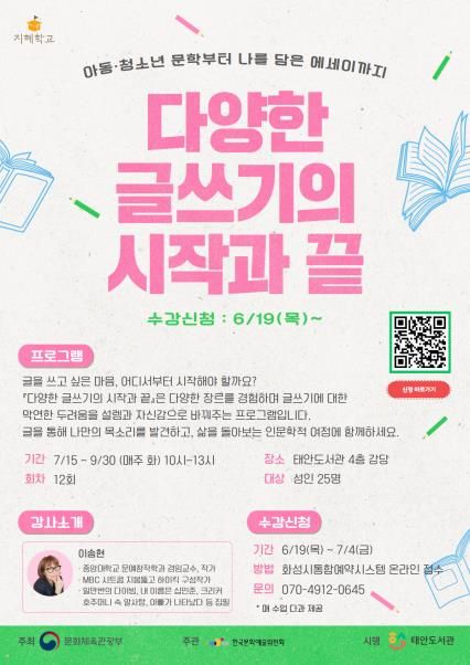 태안도서관은 ‘다양한 글쓰기의 시작과 끝 - 아동청소년문학부터 나를 담은 에세이까지’를 주제로, 다양한 형식의 글쓰기를 실습하고 자신만의 언어로 표현하는 방법을 배우는 프로그램을 운영한다.