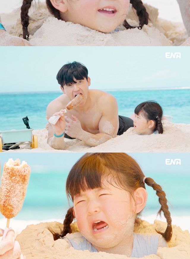 그런가 하면 사이판 마나가하섬에서는 박정우와 딸 도아의 알콩달콩 투어가 펼쳐진다. 그림 같은 바다와 하늘 아래, 해변에 자리를 잡은 박정우는 도아를 위해 직접 모래 찜질방을 만들어준다. 마치 섬을 뚫을 기세로 구멍을 파는 ‘태백장사’급 힘자랑에 감탄이 이어지고, 커다란 구멍이 완성되자 도아는 그 안에 쏙 들어가 모래 찜질을 체험한다.