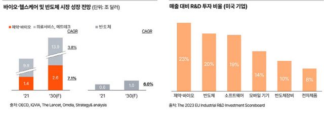 보고서에 따르면 바이오·헬스케어 산업은 연구개발(R&D) 성공 가능성이 작고 투자 규모가 크며 상업화까지 10~15년이 소요된다. 그러나 신약 개발에 성공한다면 약 10년 이상의 안정적 수익 창출이 가능하고 특허 보호를 통해 독점적 사업권을 확보할 수 있어 매력적인 산업이다. 특히 이 산업은 인간의 건강, 생존, 삶의 질 향상 등 본질적 가치와 맞닿은 고부가가치 산업으로 평가되며, 바이오·헬스케어 산업은 팬데믹 이후 글로벌 성장 산업으로 다시 부상하고 있다. 보고서는 “이 분야는 주요 하이테크 분야와 비교해도 R&D 투자 적극성이 높다”며 “기술, 데이터, AI와 융합한 정밀의학 기반의 플랫폼 전략으로 진화 중”이라고 평가했다.