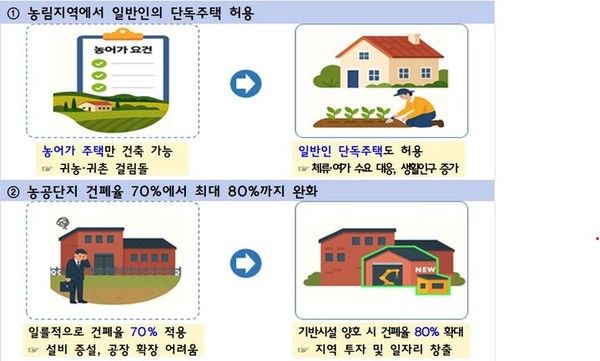 그간 농어업인이 아니면 농림지역에 단독주택을 지을 수 없었다. 이번 시행령 통과로 일반인도 부지면적 1000㎡ 미만의 단독주택을 건축할 수 있게 되면서 귀농·귀촌, 여가 등 인구 유입이 가능해졌다.