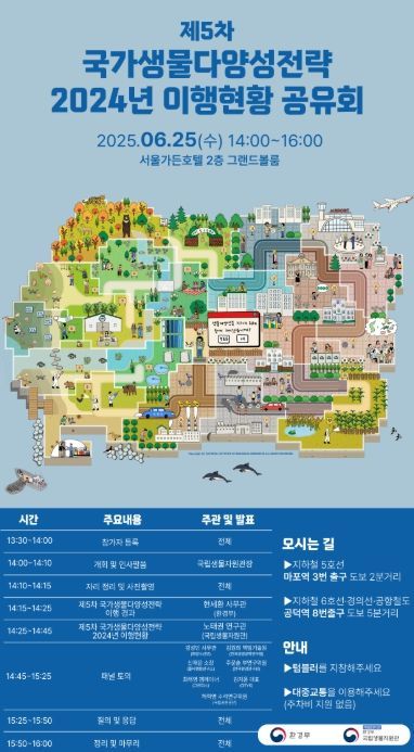 [와이뉴스] 환경부 소속 국립생물자원관은 6월 25일 오후 서울가든호텔(서울 마포구 소재)에서 ‘제5차 국가생물다양성전략(2024~2028)’에 대한 2024년도 이행 현황을 국민과 공유하는 행사를 갖는다고 밝혔다.