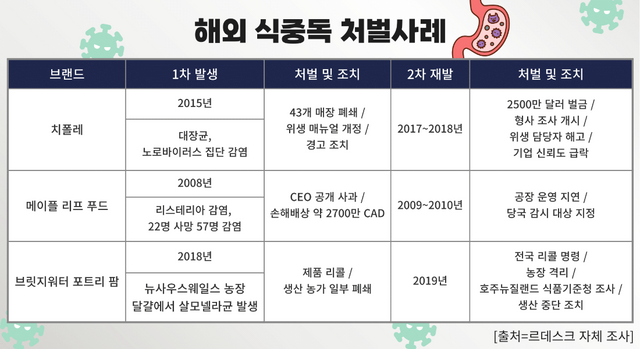 미국의 유명 패스트푸드 체인 치폴레는 2015년부터 2018년까지 노로바이러스, 클로스트리디움 등 다양한 식중독 사고가 5건 이상 반복됐다. 첫 사고 당시 수백 명이 감염돼 일부 매장이 폐쇄되고 위생 매뉴얼이 개정되는 등 조치가 이뤄졌지만, 형사 처벌은 없었다. 그러나 누적 감염자가 1100명을 넘어서자 미 법무부는 치폴레를 형사 기소 유예 조건으로 식품업계 최대인 2500만달러(한화 약 340억원)의 벌금을 부과했다. 이와 함께 위생 책임자 일부를 해고하고, 위생 관리 프로그램을 강화하는 의무 조치도 부과됐다.