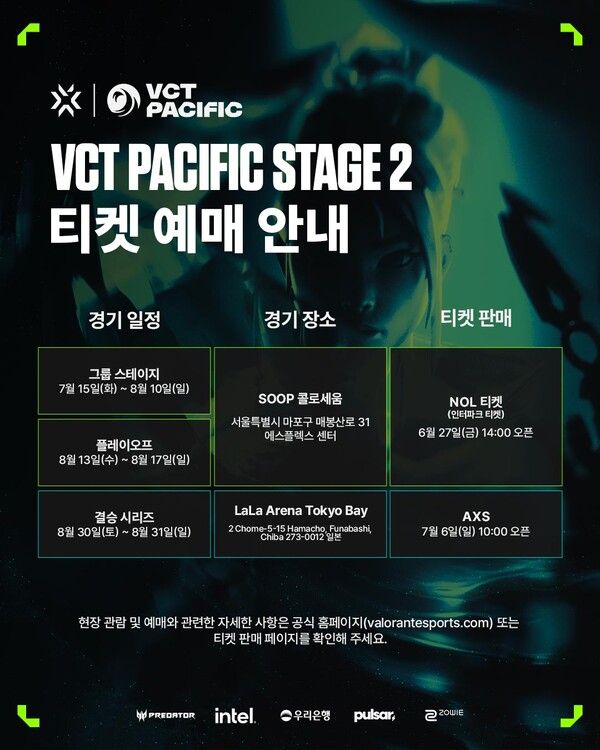 한편, 한국에서 열리는 VCT 퍼시픽 스테이지 2의 조별 예선 및 플레이오프의 티켓은 6월 27일부터, 일본에서 열리는 결승 진출전과 최종 결승전의 티켓은 7월 6일부터 판매된다.