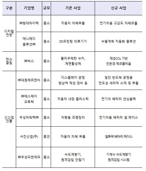 사업재편계획 승인기업의 주요 내용은 다음과 같다. 자동차 부품사인 ㈜에스제이오토텍은 전기차용 배터리 센싱블록 시장에 진출하고, ㈜대원에프엔씨는 반도체 공정에서 요구되는 정전기 제어기능을 갖춘 전도성 세라믹 소재를 국산화한다. ㈜빅스는 재생 CO2로 석유계 원료 일부(약 30%)를 대체한 친환경 에코폴리올을 생산하고, 서진산업㈜은 셀-모듈-팩의 배터리 구조에서 모듈을 생략하는 셀투팩 방식의 배터리케이스를 개발해 변화하는 시장에 적극 대응해 나간다.
