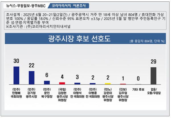24일 뉴시스 광주전남본부와 무등일보, 광주MBC가 코리아리서치인터내셔널에 의뢰해 실시한 여론조사에 따르면 차기 광주시장 후보군 선호도에서 더불어민주당 민형배 의원이 30%를 얻어 22%에 그친 강기정 현 시장을 오차범위(±3.5%포인트) 밖에서 8%포인트 앞섰다.(조사일시 2025년 6월20~21일, 표본오차 95% 신뢰수준 ±3.5%포인트, 중앙여론조사심의위원회 홈페이지 참조)