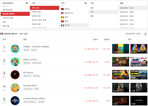 마코빌의 대표 IP '치타부'가 플레이보드 발표 멕시코 주간(6월 9일~6월 15일) 영화/애니메이션 인기 유튜브 순위에서 1위를 달성하며 역사적 성과를 기록했다. 러시아 출신의 글로벌 키즈 IP ‘마샤와 곰’을 제치고 이룬 쾌거로, K키즈 콘텐츠의 글로벌 경쟁력을 입증하고 있다.