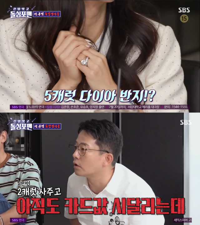 이날 이상민은 하원미가 착용하고 있는 반지를 유심히 살펴보다 “얼마 전에 내가 아내랑 웨딩반지를 둘러봐서 아는데 착용하신 거 보니까 이건 한 (다이아몬트) 5캐럿 돼 보인다. 맞느냐”고 물었다.