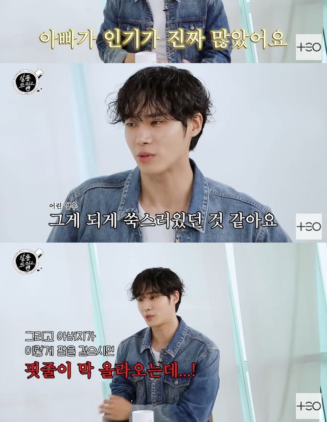 이에 추영우는 "어렸을 때 아빠 손잡고 다닐 때 인기가 진짜 많으셨다. 어딜 가든"이라며 "그게 되게 쑥스러웠던 것 같다. 그리고 아버지가 이렇게 팔을 걷으시면 핏줄이 막 올라오는데 그게 어린 나이에 창피했던 것 같다"라고 어린 시절 아버지의 인기에 난감했던 심정을 웃으며 고백했다.